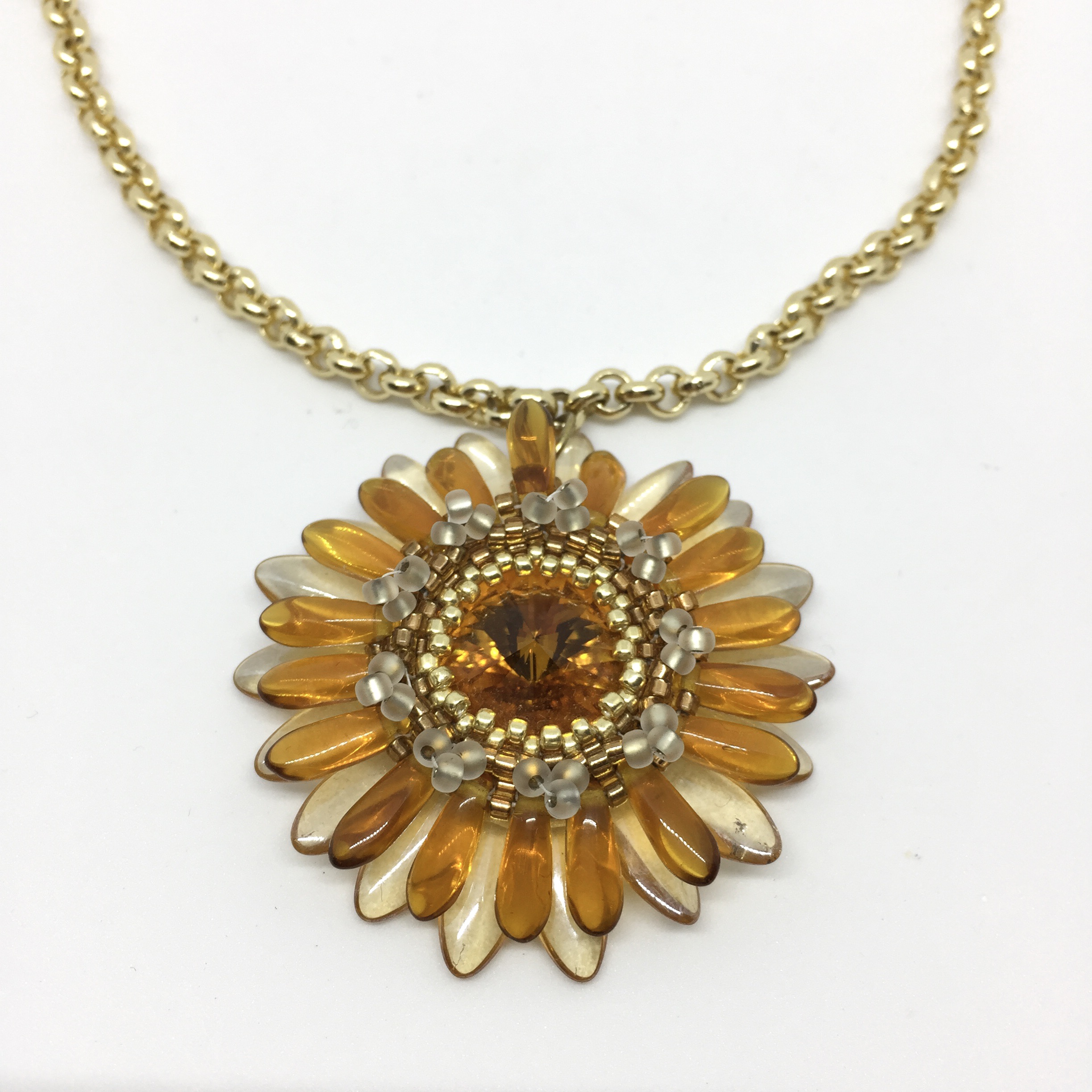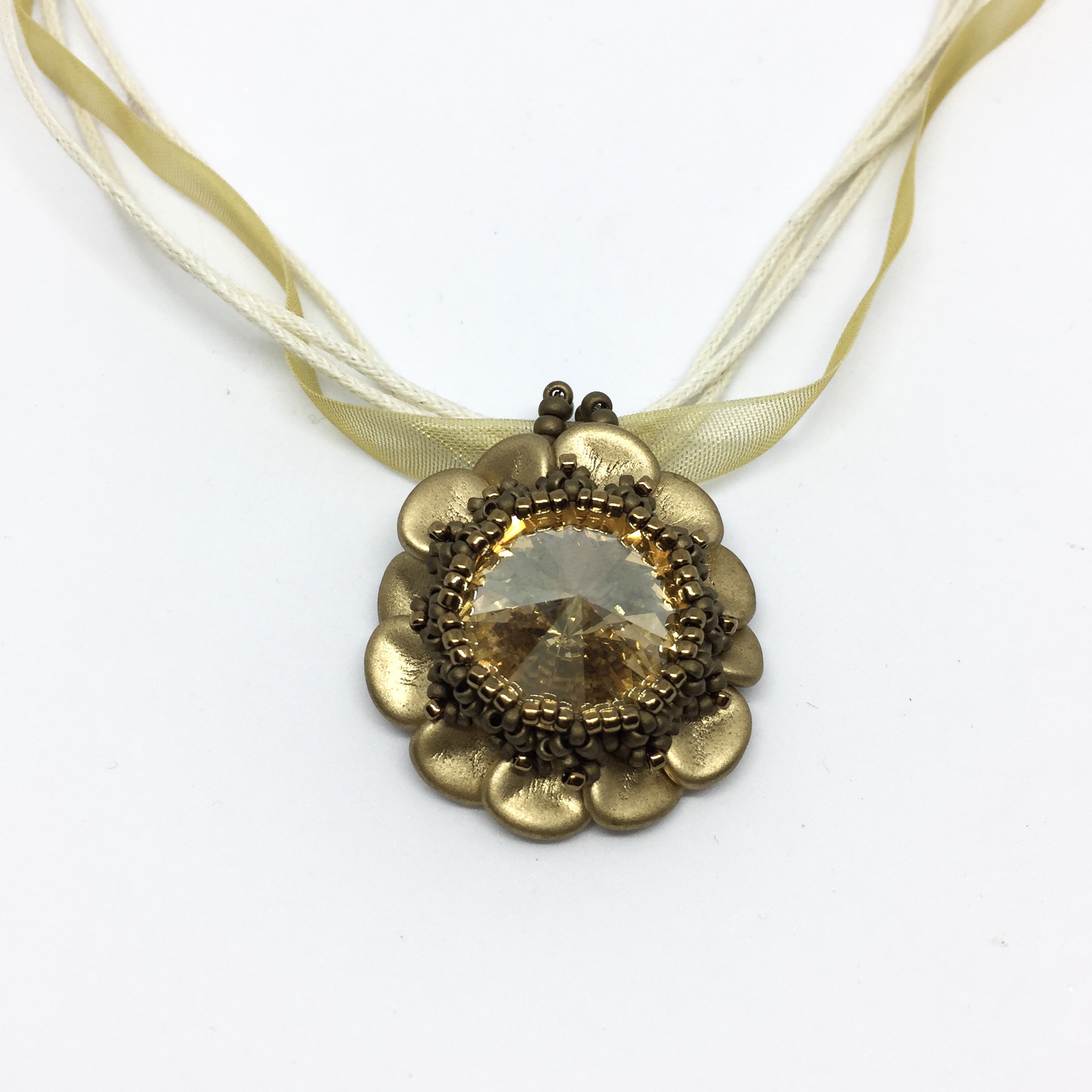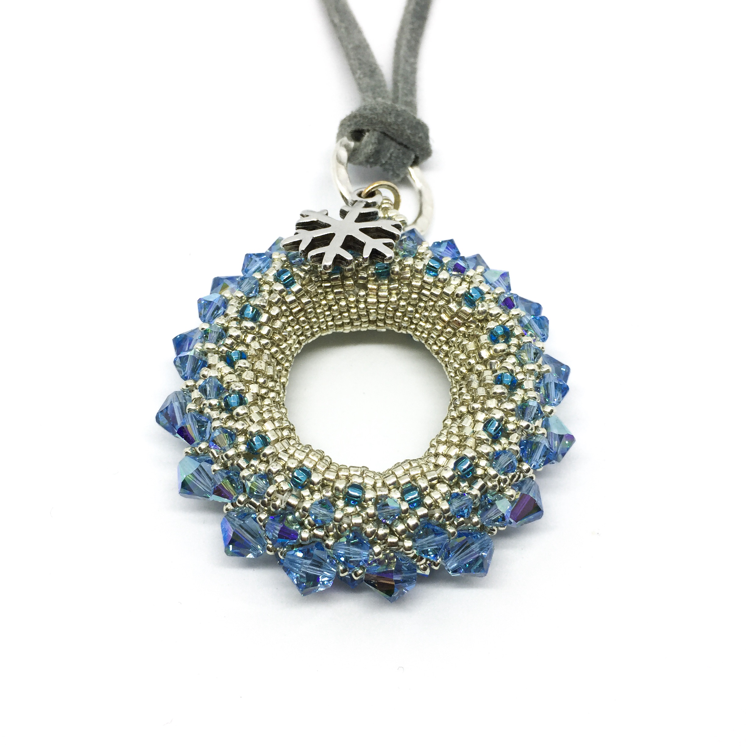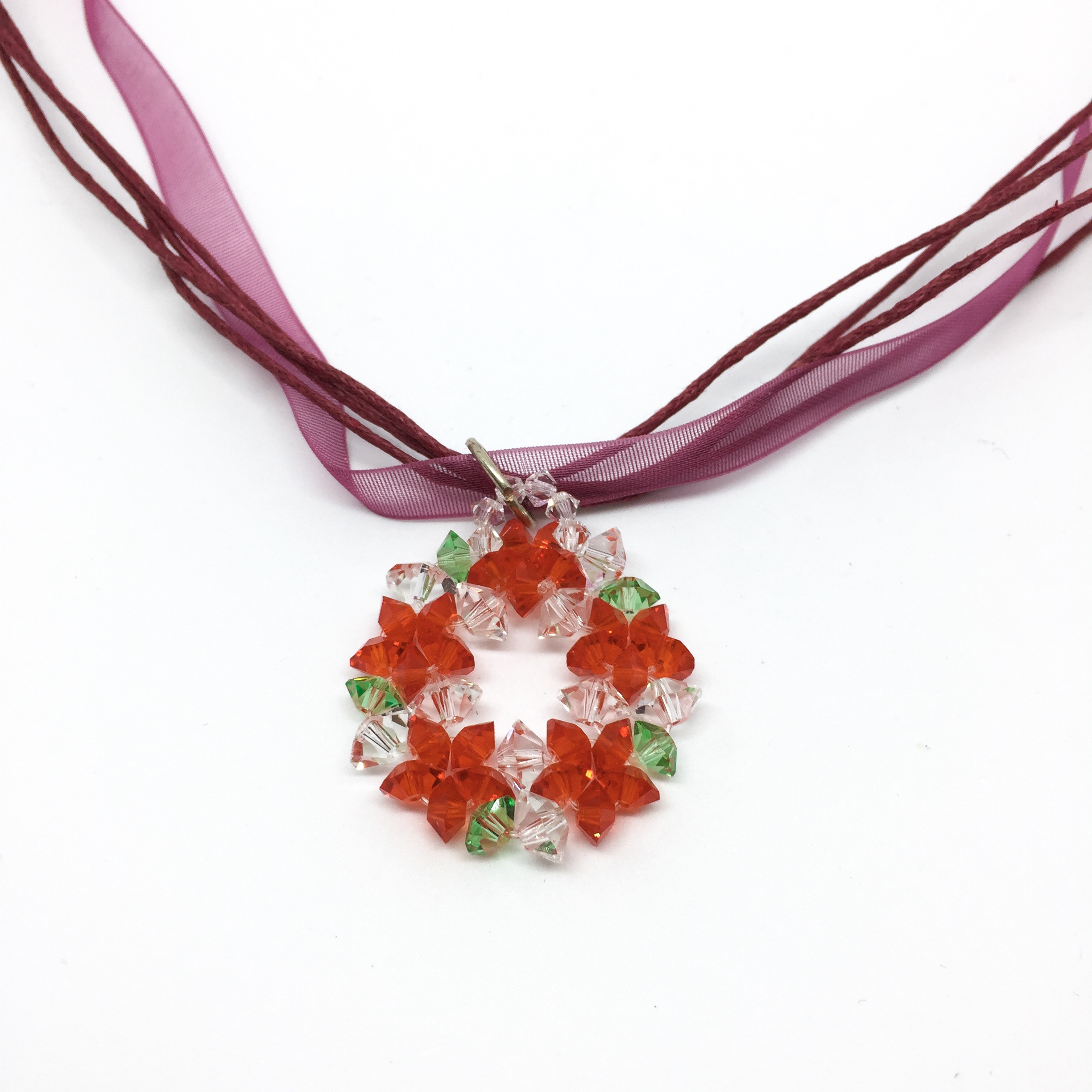 Handgefertigt in Angle-Weave Technik aus Swarovski-Biconen, Glassschliffperlen und einem Rivoli Stein.