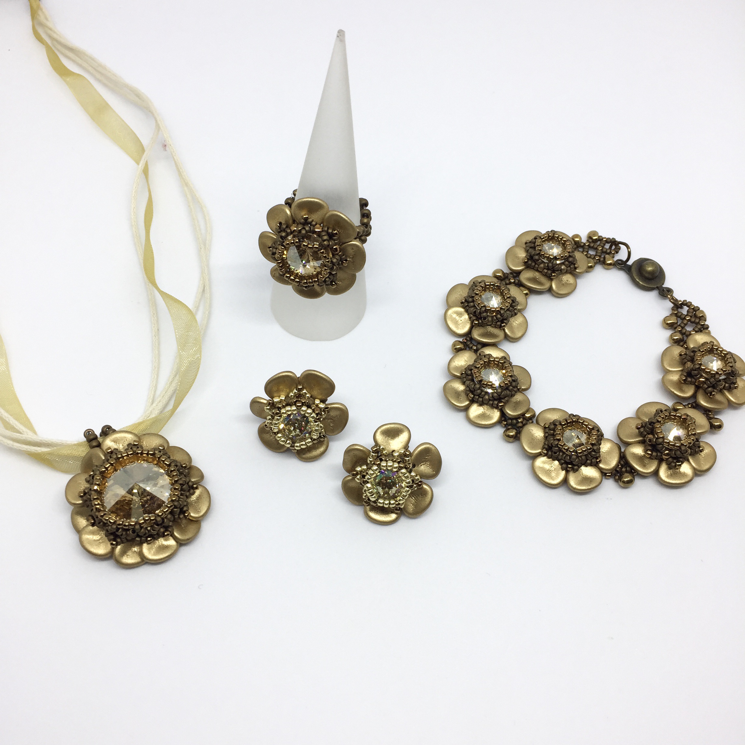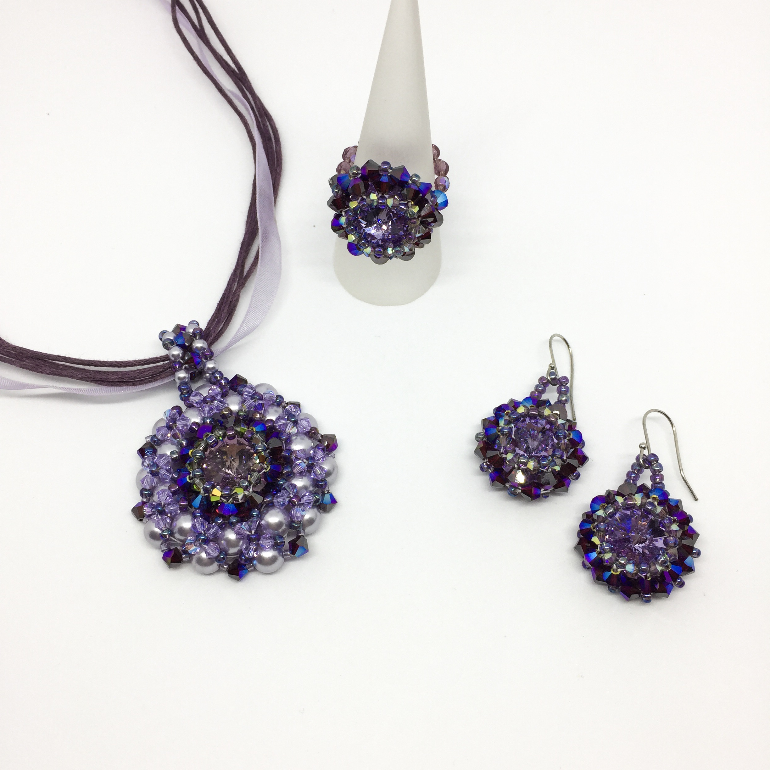 Handgefertigt in Angle-Weave Technik aus Swarovski-Biconen, Glassschliffperlen und einem Rivoli Stein.